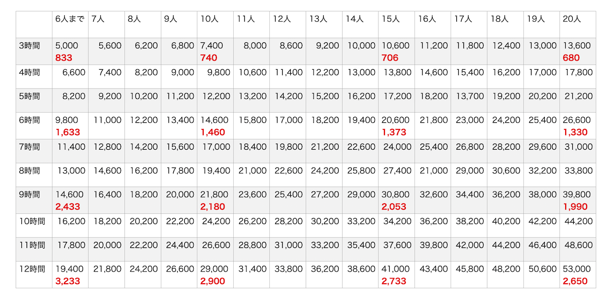 表示料金は全てお部屋ごとの料金で、1名様あたりの料金ではありません。1部屋で7名以上でのご利用の場合に限り、1名様につき1時間 200円が追加料金となります。