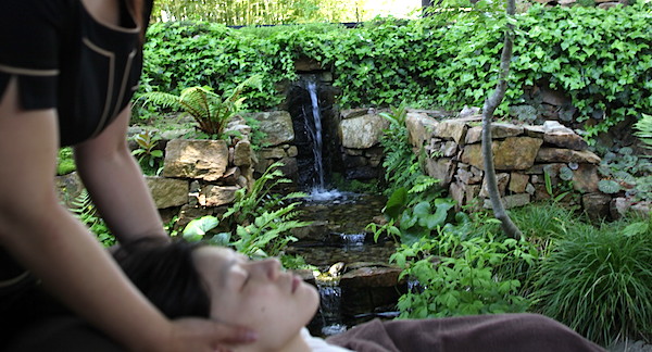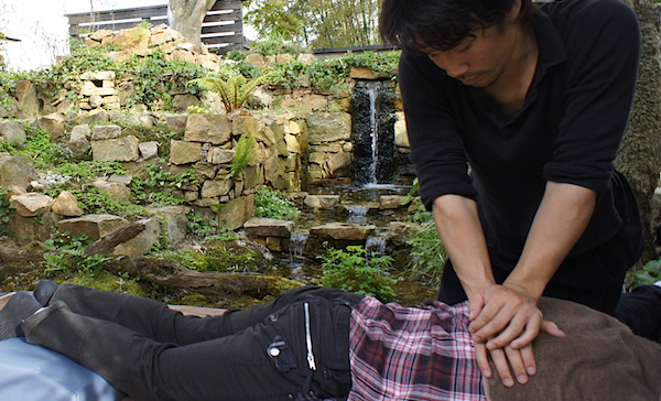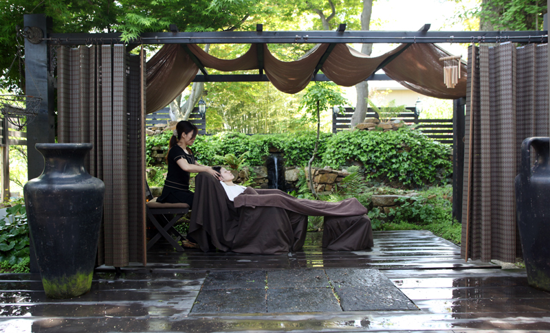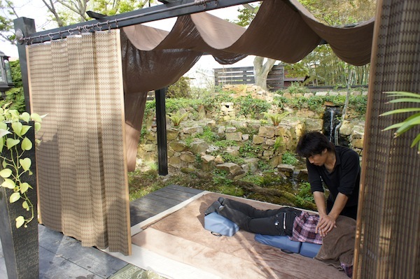 春と秋の晴れた日には、ガーデンの水辺に視覚をさえぎるスペースを作り施術を受けて頂きました。滝の音と風を肌で感じながら、心と体を安らげようというものです。水音が頭の中のノイズをかき消して、神経レベルで体の力が抜けていきます。施術をする側としても、空間の与える影響の重要性を認識したイベントでした。空間の力が加わりとても相乗効果の高いものになりました。