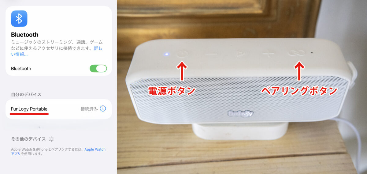 またBluetoothで接続してiPhoneなどお手持ちのデバイスの音楽を流すことができます。スピーカー上部の一番右にある「ペアリングボタン」を押して接続します。デバイス側のbluetoothをONにして”FunLogy Portable“と表示されたら、クリックしてペアリング完了です。(この設備を使わずにご自分でプレーヤー等を持ち込んで頂いても構いません。)
